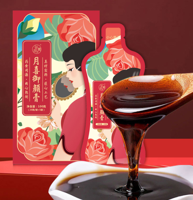 產品描述:【品名】月喜御顏膏【類別】植物飲料【配料】飲用水、麥芽糖漿、蜂蜜、紅棗、桑椹、人參、阿膠、山藥、桔紅、香瓣紅玫瑰、枸杞、甘草、龍眼肉、茯苓、白芷、沙棘、百合、桃仁、葛根【凈含量】20克(20克/袋5袋)【食用方法】開袋即飲,每天1-3袋,每一次1袋,直接口服或兌200毫升開水沖調飲用食用限量:本品每100g加入人參(人工種植)2.4g,人參食用量3g/天【執行標準】GB/T31326【食品生產許可